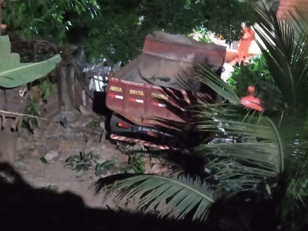 O caminhão caiu numa altura de cinco metros no quintal da casa, após ter colidido em outros dois caminhões e um muro.