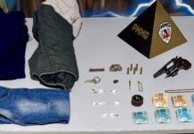 A primeira averiguação foi na Rua Cinco, 35, onde os policiais foram recebidos por um rapaz com iniciais D.S.C.S., 20 anos, uma mulher L. P.S., 23 anos e um homem R.C.S., 53 anos, que após tomarem conhecimento da denúncia, autorizaram a entrada dos PMs na residência para as buscas, onde foram localizados um revólver de fabricação artesanal calibre .22 com munições intactas, sessenta e nove pedras de crack, uma porção de maconha, balança de precisão, rolo de plástico filme e vários pinos vazios. D.S., disse estar residindo na maioria dos dias da semana na casa de sua namorada L.P.S.