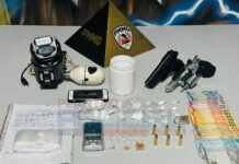 O indivíduo admitiu que em sua residência haviam drogas e que a chave encontrada era do cadeado de sua casa.No local, foram apreendidos maconha, cocaína, munições de diversos calibres, materiais para embalar de drogas, balanças de precisão, R$855,00 em dinheiro e um dólar.