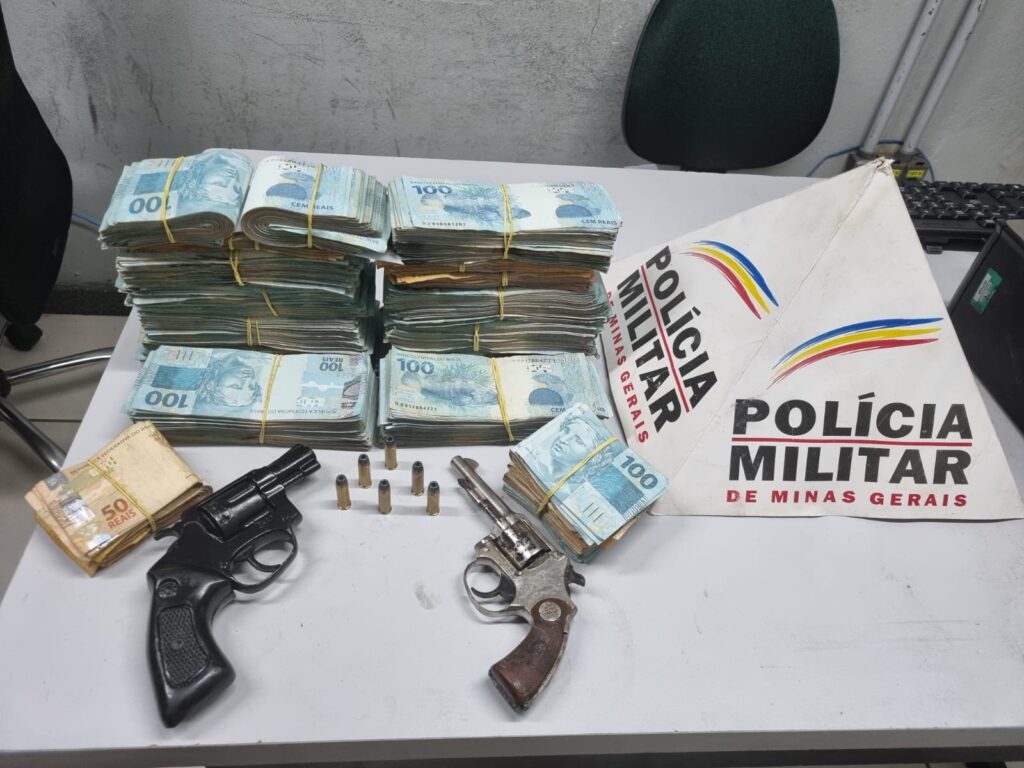 No jardim do imóvel, foi encontrada uma sacola enterrada contendo R$ 233.800,00 em espécie. A origem do dinheiro não foi devidamente comprovada pelos envolvidos. Todo o material foi apreendido, incluindo as armas de fogo, munições e o valor em dinheiro. A motocicleta utilizada pelo suspeito foi removida ao pátio credenciado.
