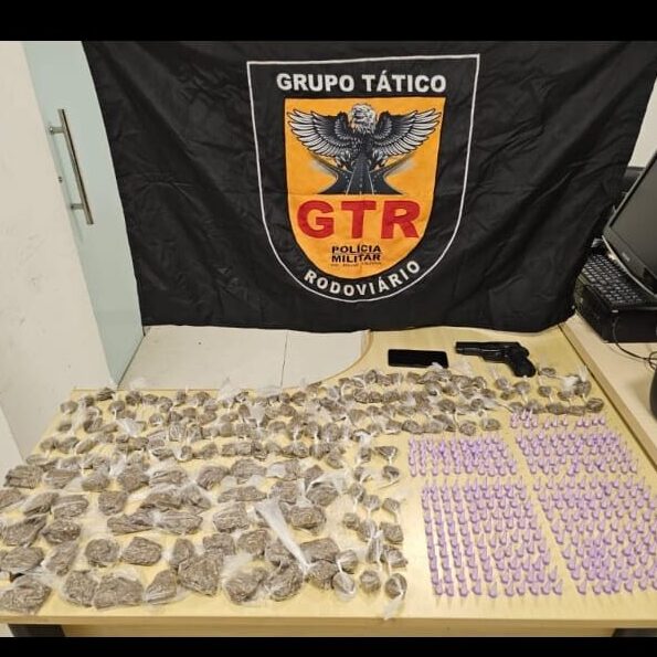 Os passageiros foram revistados, um deles demonstrou total intranquilidade,o que chamou atenção dos PMs, sendo constatado que ele possui várias passagens por tráfico de drogas,fizeram buscas em sua mochila, sendo flagrado transportando 313 pinos de cocaína,186 porções de maconha, simulacro de arma de fogo e um celular.