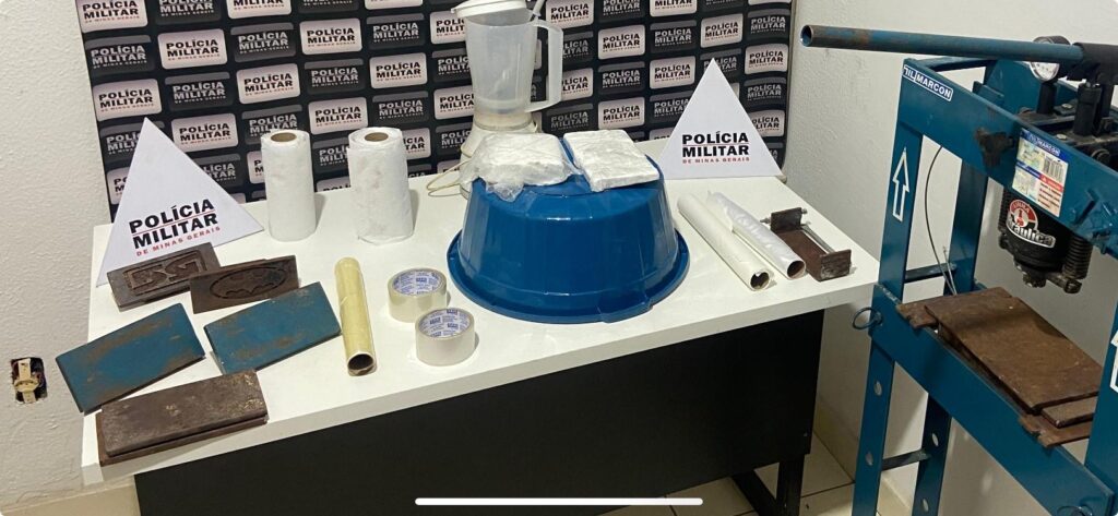 Durante a ação, os militares apreenderam uma prensa hidráulica, um liquidificador, duas barras de cocaína, três plásticos filme e uma colher, todos utilizados no processo de manipulação e embalagem do entorpecente.