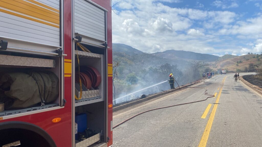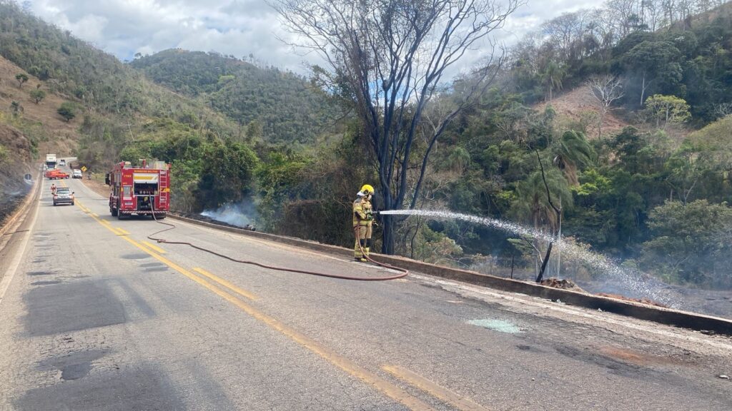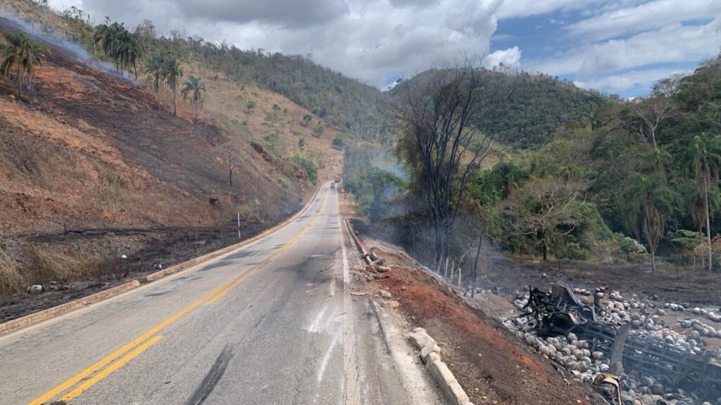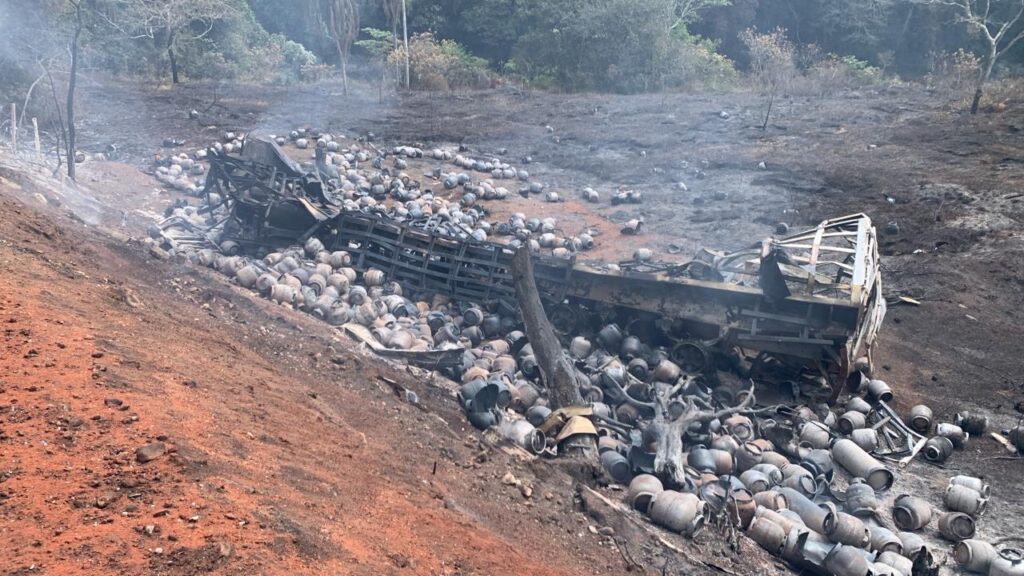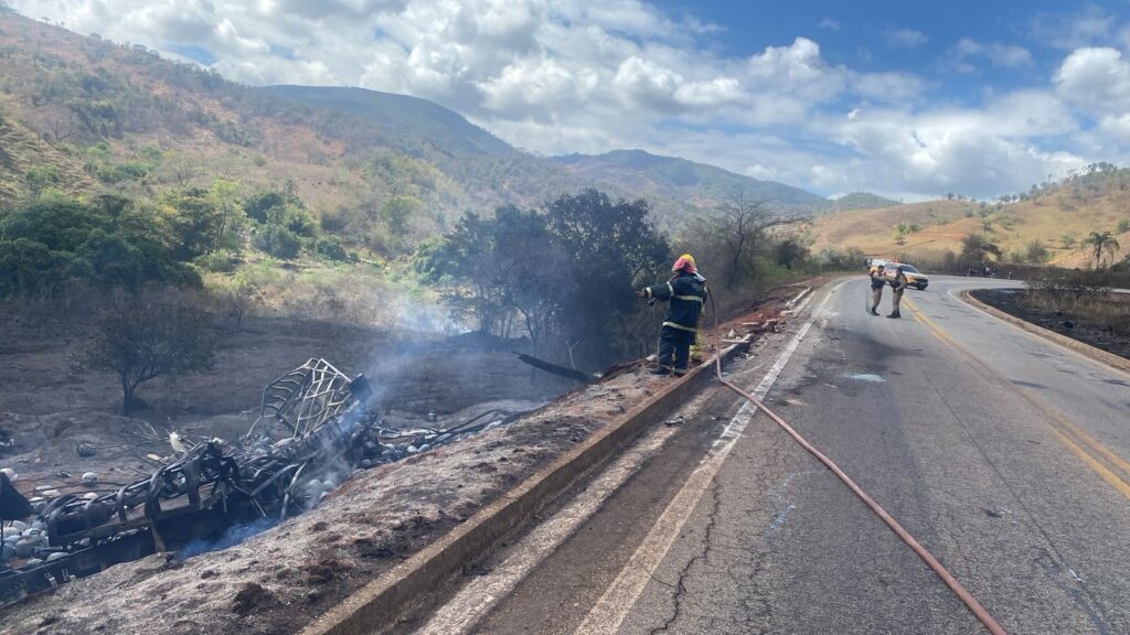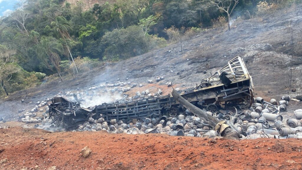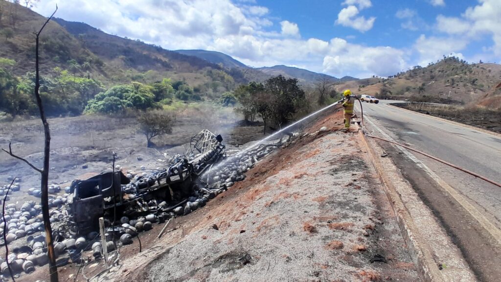Na manhã deste sábado (27), um caminhão carregado com botijões de GLP saiu da pista e caiu em um barranco na rodovia MG-120, entre Santa Maria de Itabira e Ferros. O veículo foi totalmente consumido pelas chamas.