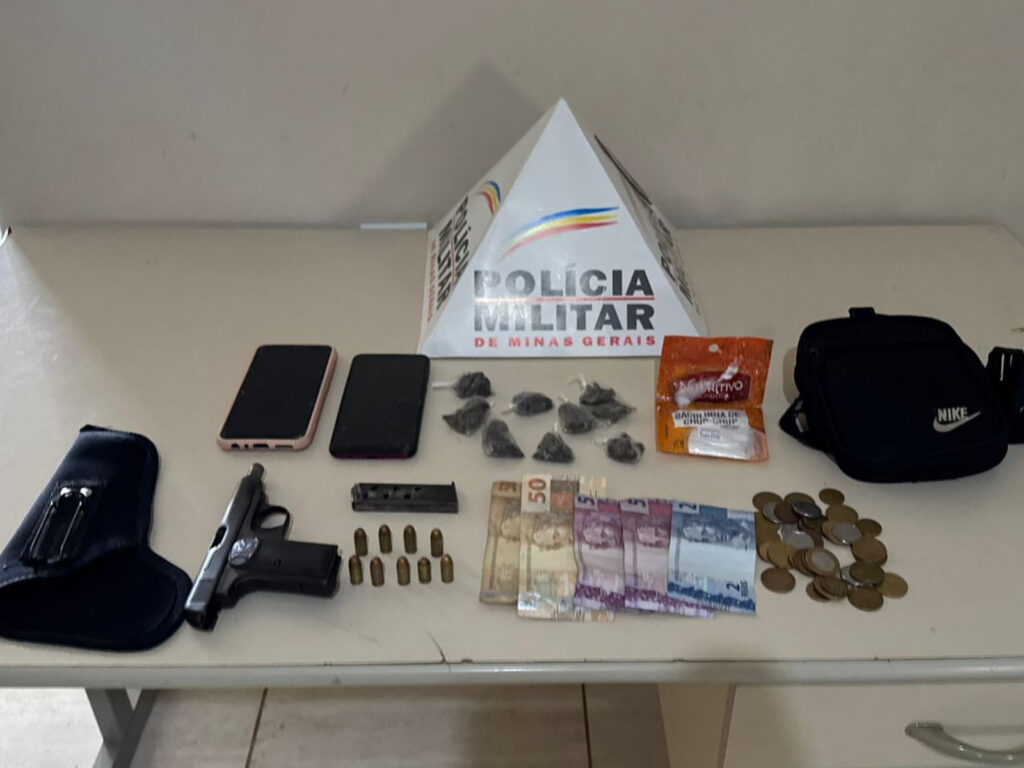 Ao perceber a aproximação da equipe policial, o suspeito tentou fugir para dentro de sua residência, mas foi acompanhado e abordado. Durante as buscas, os militares localizaram uma pistola calibre .380, nove munições intactas, oito buchas de maconha, R$ 120 em dinheiro e dois aparelhos celulares.