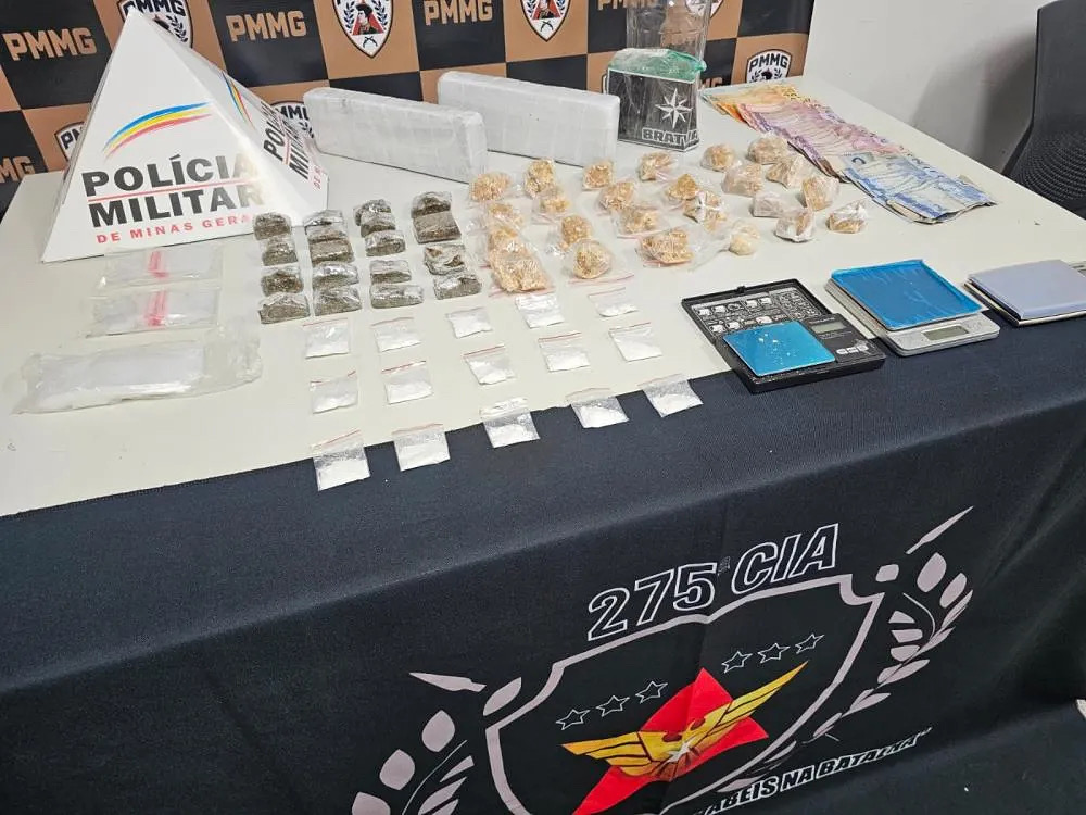 O suspeito foi abordado e, com ele, encontradas porções de maconha, crack e cocaína. Durante buscas em dois endereços ligados ao adolescente, foram localizados 18 tabletes e duas barras de maconha (uma delas fracionada), 15 porções de cocaína, 24 porções de crack, três balanças de precisão, R$ 360 em dinheiro e documentos pessoais.