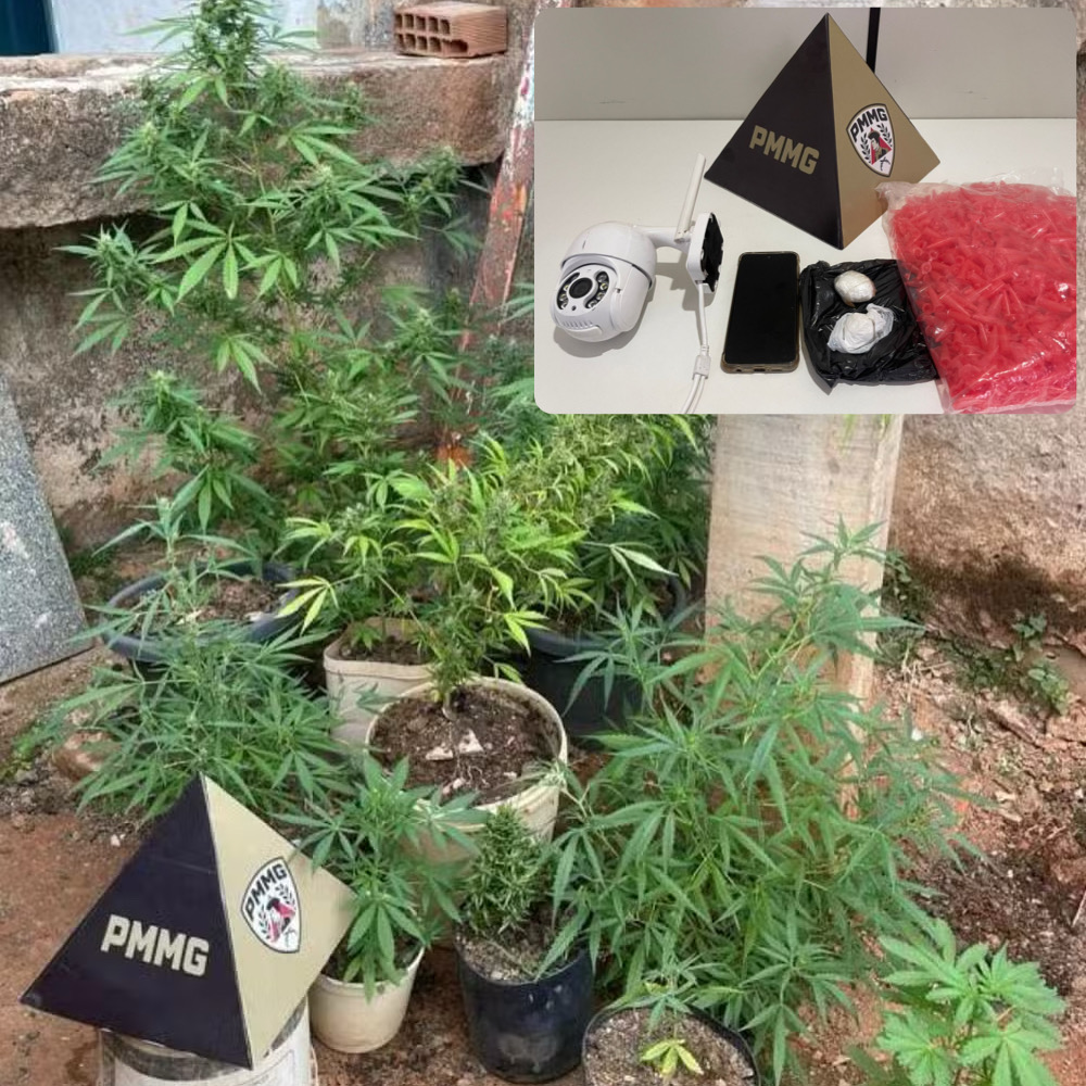 De imediato, equipes Táticas da 85ª Companhia deslocaram-se até o local, onde prenderam o suspeito e apreenderam mais de 10 pés de maconha, já próximos do ponto de colheita, além de duas porções e dois pinos de cocaína, uma câmera de segurança e um celular.