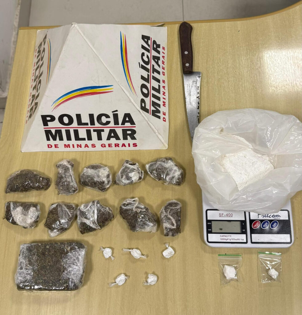 Com o apoio do cão farejador Lyon, as equipes localizaram uma barra e dez tabletes de maconha, oito porções de cocaína, duas balanças de precisão, uma faca e materiais para dolagem.
