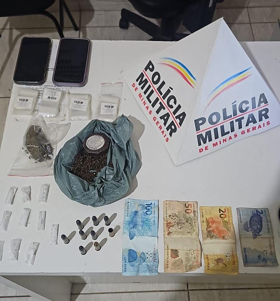 As diligências prosseguiram nas residências dos suspeitos, onde os militares encontraram mais materiais relacionados ao tráfico. Na casa do homem, foram apreendidos seis papelotes de cocaína, dois tabletes de maconha, oito munições calibre .38 intactas, uma deflagrada, R$ 22,00 em dinheiro e embalagens plásticas. Já na residência da mulher, foi localizada uma porção de maconha e um triturador (dichavador).