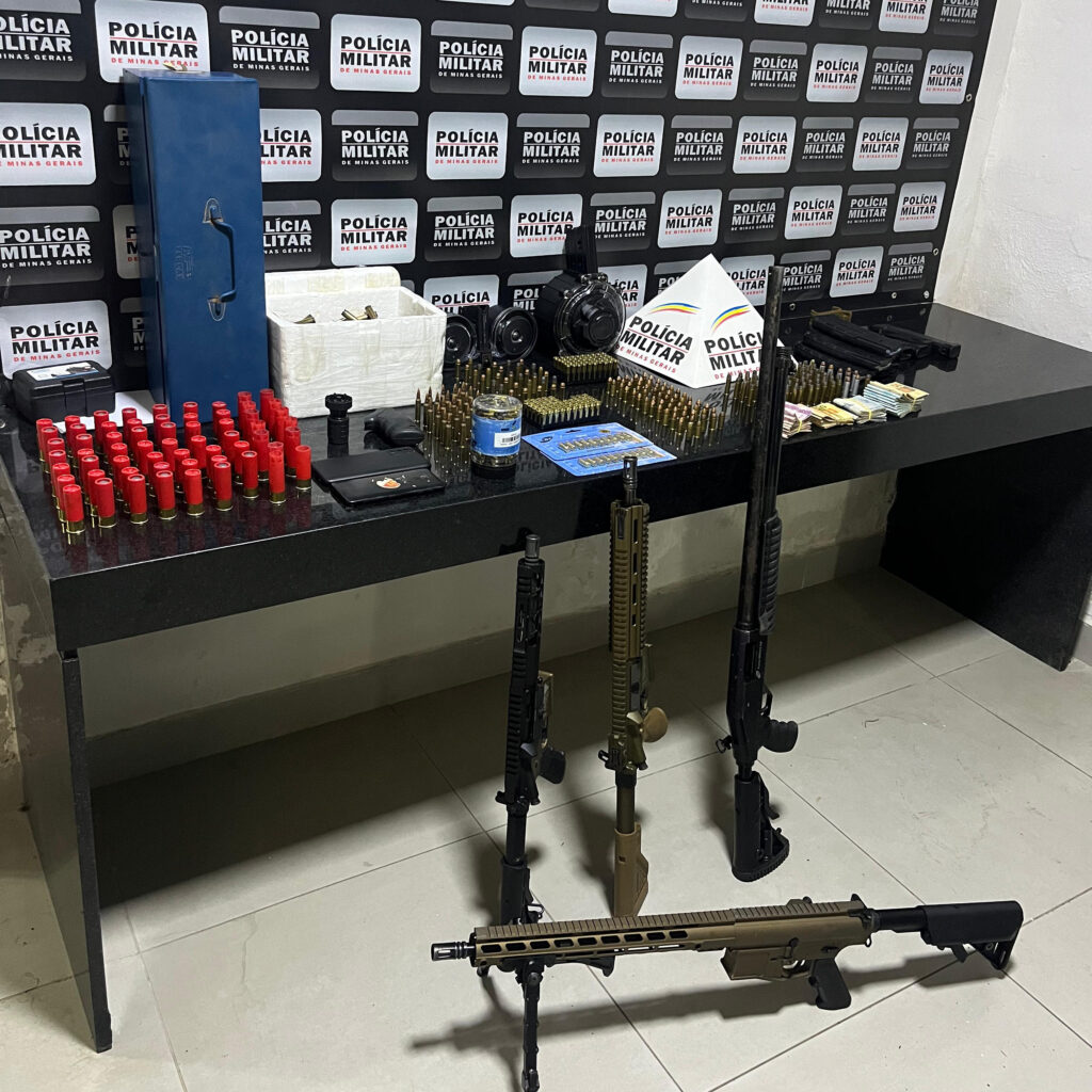 Durante as diligências, foram localizados armamentos de alto calibre, grande quantidade de munições e dinheiro em espécie. Dois indivíduos, de 74 e 38 anos, foram presos e encaminhados à Delegacia de Polícia Civil.