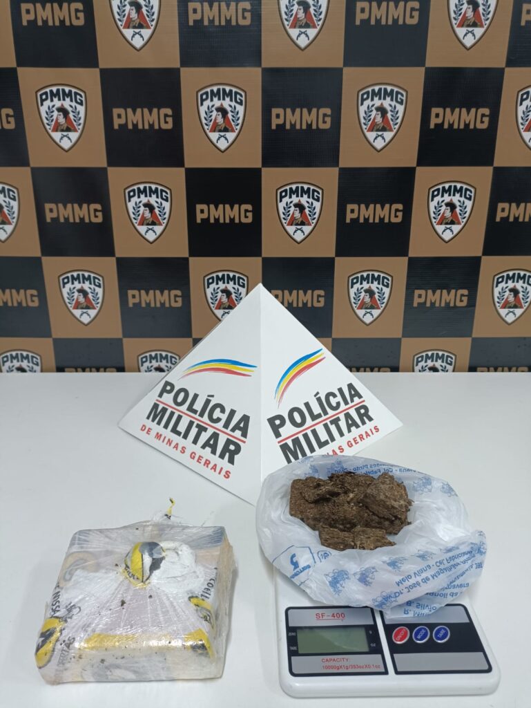 Durante a abordagem, os militares verificaram a situação do condutor e do veículo. Ao realizar buscas no interior do carro, localizaram uma barra e cinco tabletes de maconha, totalizando mais de meio quilo da droga, além de uma balança de precisão.