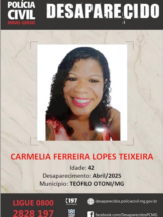 A Polícia Civil de Minas Gerais divulgou nesta segunda-feira um novo pedido de apoio da população para localizar Carmelia Ferreira Lopes Teixeira, de 42 anos, desaparecida desde abril de 2025, no município de Teófilo Otoni, no Vale do Mucuri.