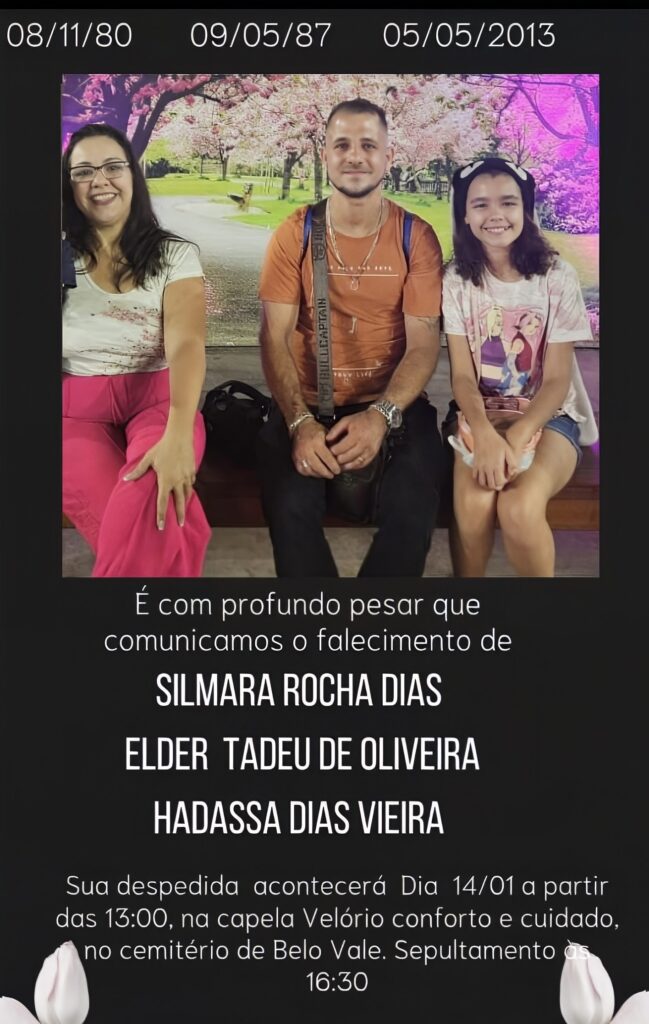Segundo a Polícia Rodoviária Federal (PRF), as vítimas fatais foram identificadas como Elder Tadeu de Oliveira, 38 anos, a esposa dele, Silmara Rocha Dias, 45 anos, e a filha do casal, Hadassa Dias Vieira, 12 anos. A família era de Santa Luzia, na Região Metropolitana de Belo Horizonte, e seguia viagem com destino ao litoral da Bahia.