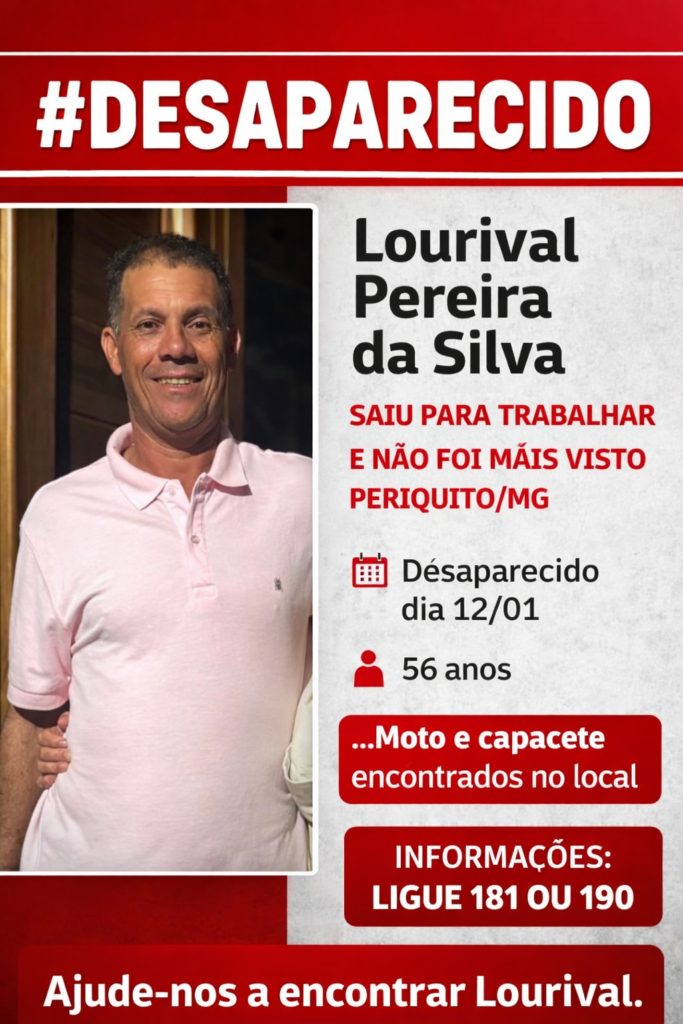 A família de Lourival Pereira da Silva, de 56 anos, busca informações sobre seu paradeiro após o homem desaparecer na última segunda-feira, 12 de janeiro, na cidade de Periquito/MG.