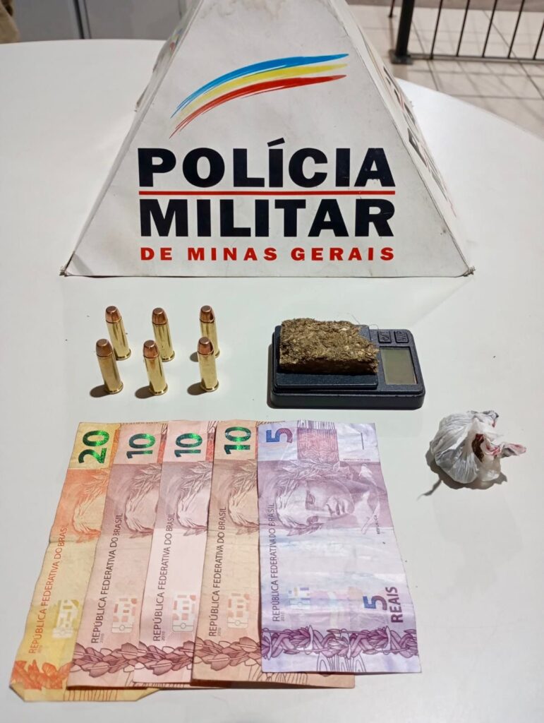 Diante da irregularidade, foi realizada a abordagem policial. Durante a busca pessoal, foram localizados com o abordado uma porção de maconha, seis cartuchos de munição calibre .38 e a quantia de R$ 55,00 em dinheiro.