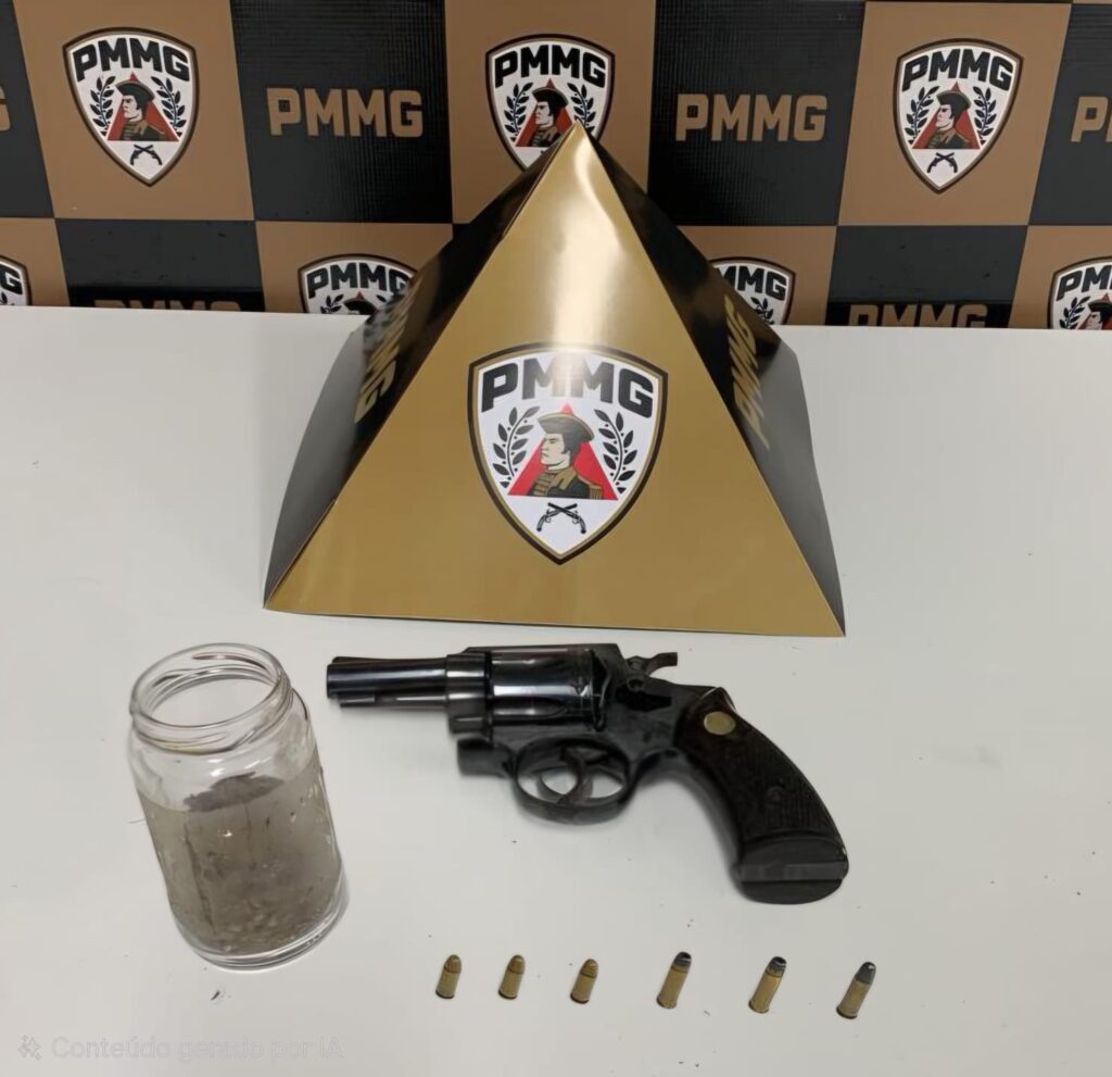 Com autorização para entrar no imóvel, os policiais realizaram buscas e localizaram uma porção de maconha no quarto, dentro do guarda-roupa. Também foi apreendido um revólver calibre .32, com cinco cartuchos intactos e um cartucho picotado.