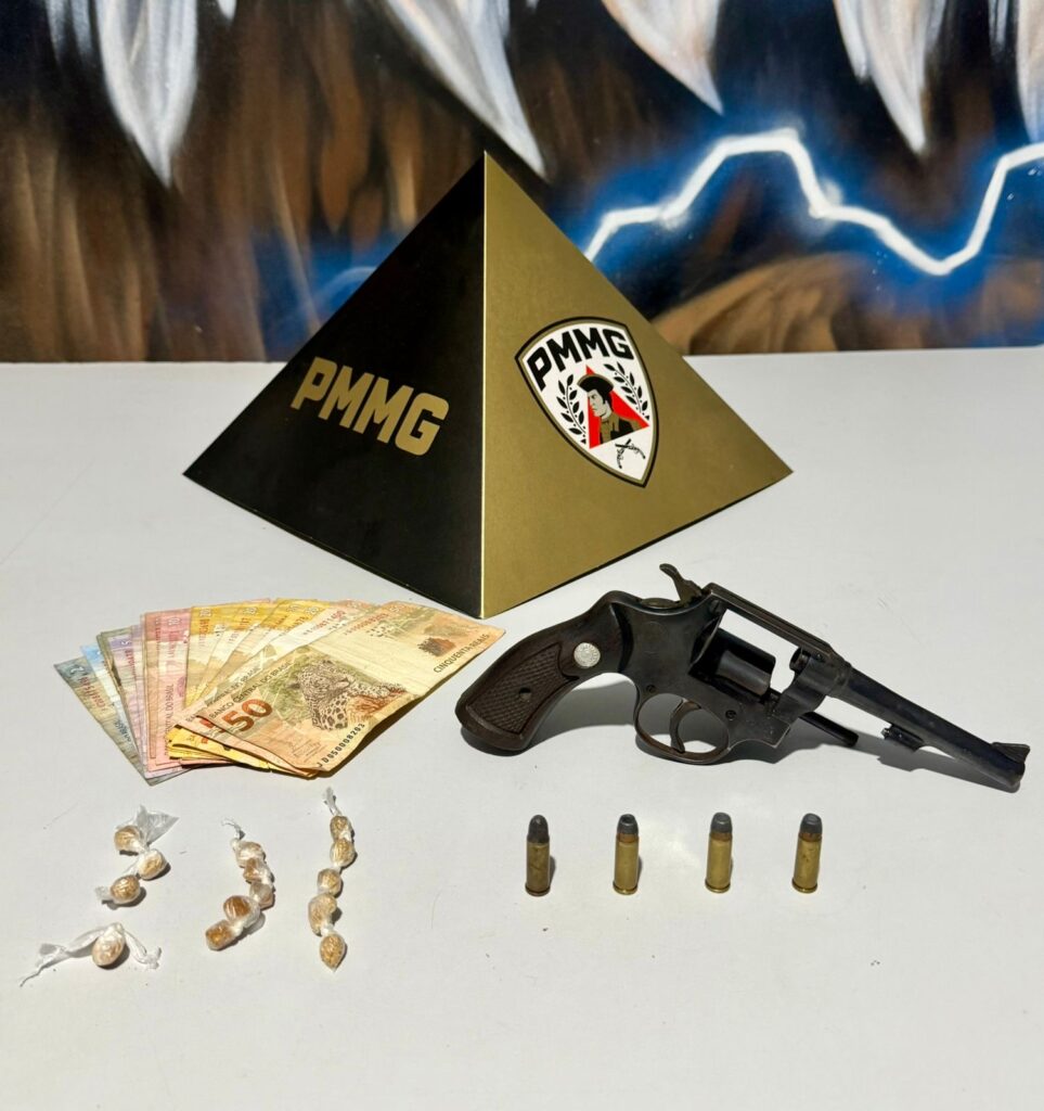 Durante busca pessoal, foi localizado com o abordado, de 17 anos, um revólver calibre .32 municiado com quatro cartuchos, além de uma quantia em dinheiro. Na sacola dispensada por ele, foram encontradas 14 pedras de crack, embaladas e prontas para comercialização.