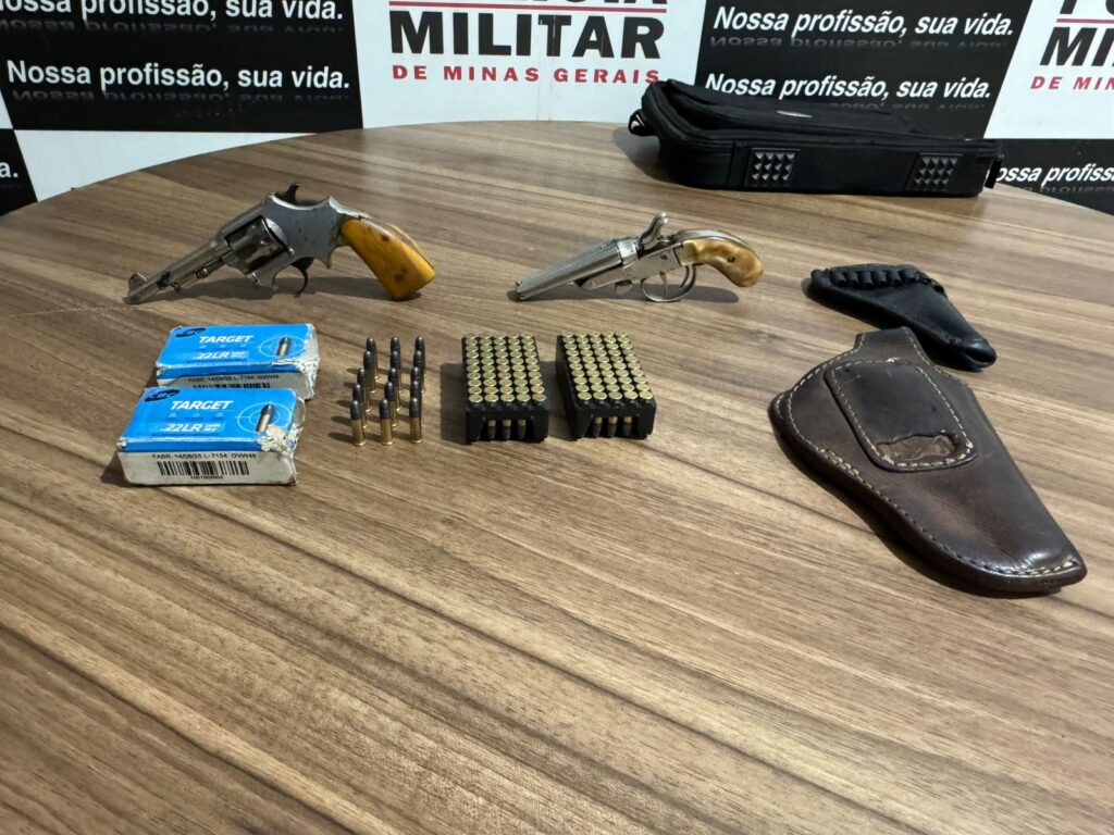 Ao verificarem o conteúdo da bolsa, os policiais localizaram duas armas de fogo calibre .22, ambas municiadas, além de 115 munições intactas.