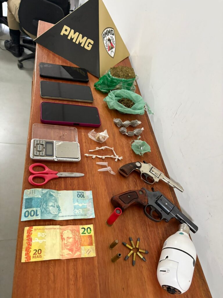 Durante as buscas, os militares apreenderam dois revólveres, sendo um calibre .38 e outro calibre .22, além de munições de diversos calibres. Também foram encontrados entorpecentes, incluindo crack, cocaína e maconha, uma balança de precisão, três celulares, uma câmera de monitoramento, dinheiro em espécie e uma motocicleta.