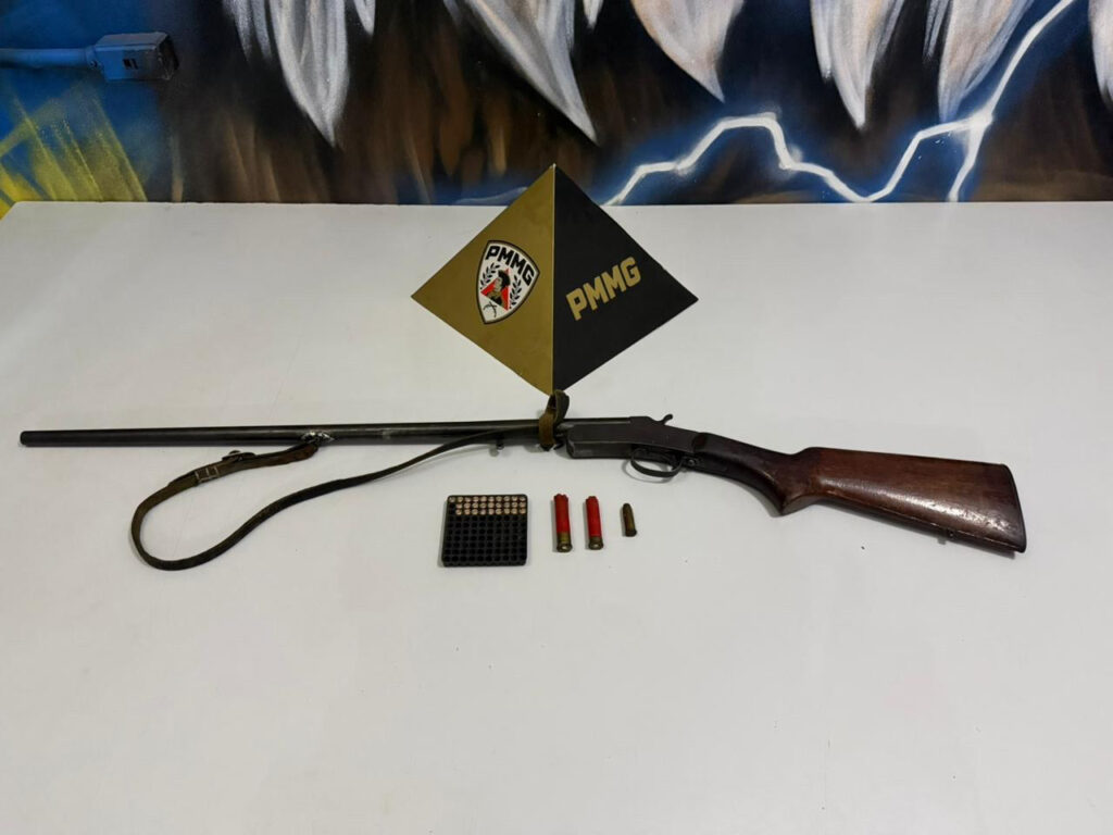 Em continuidade à ocorrência, os policiais realizaram buscas na residência do autor, onde encontraram uma espingarda calibre .28, além de munições de diversos calibres e espoletas.