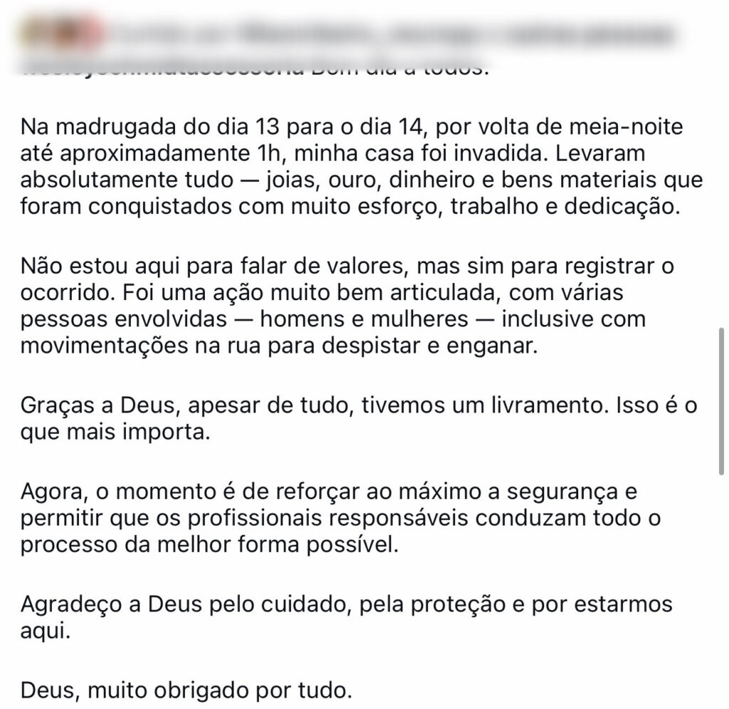 Ainda segundo a vítima, o quarto possui fechadura eletrônica com uso de senha, o que levanta a suspeita de que os criminosos tinham conhecimento prévio da estrutura do imóvel.