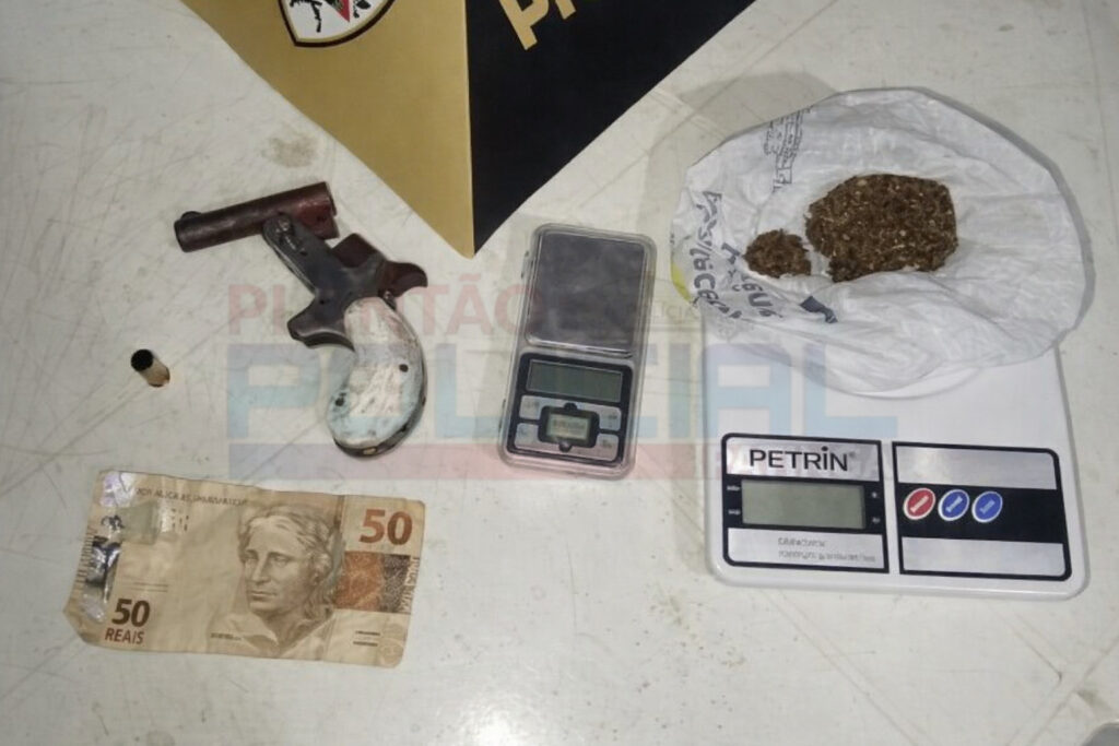 Durante a operação, foram localizados um tablete de maconha, duas balanças de precisão e uma garrucha calibre 38 com um cartucho deflagrado.