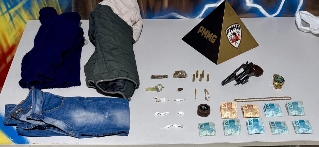 Durante a operação, os policiais apreenderam um revólver calibre .38 carregado com cinco cartuchos intactos, além de drogas, dinheiro, uma motocicleta adulterada e diversos objetos de origem suspeita.